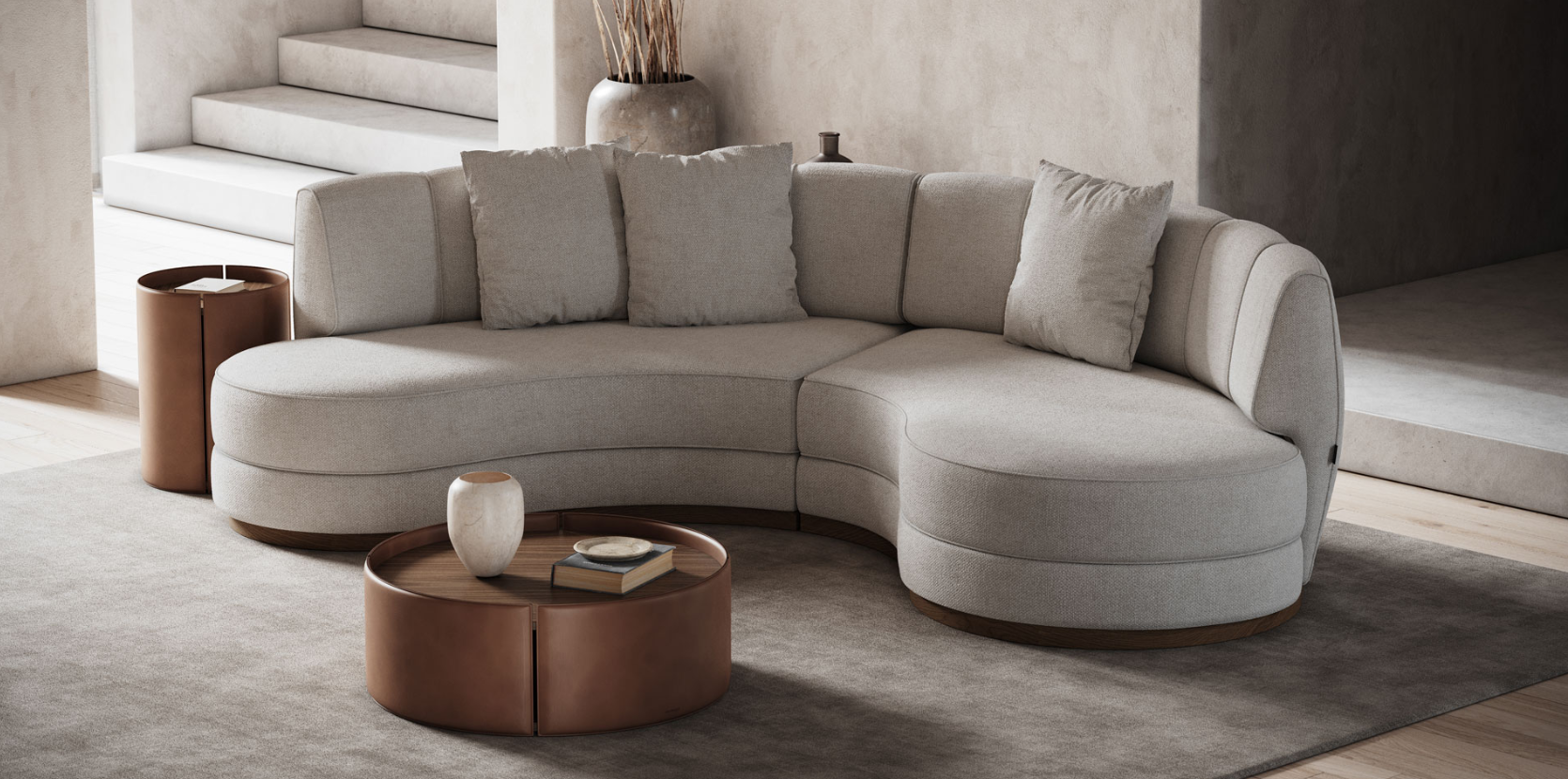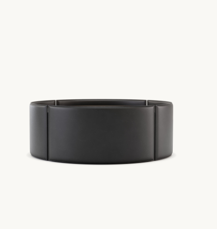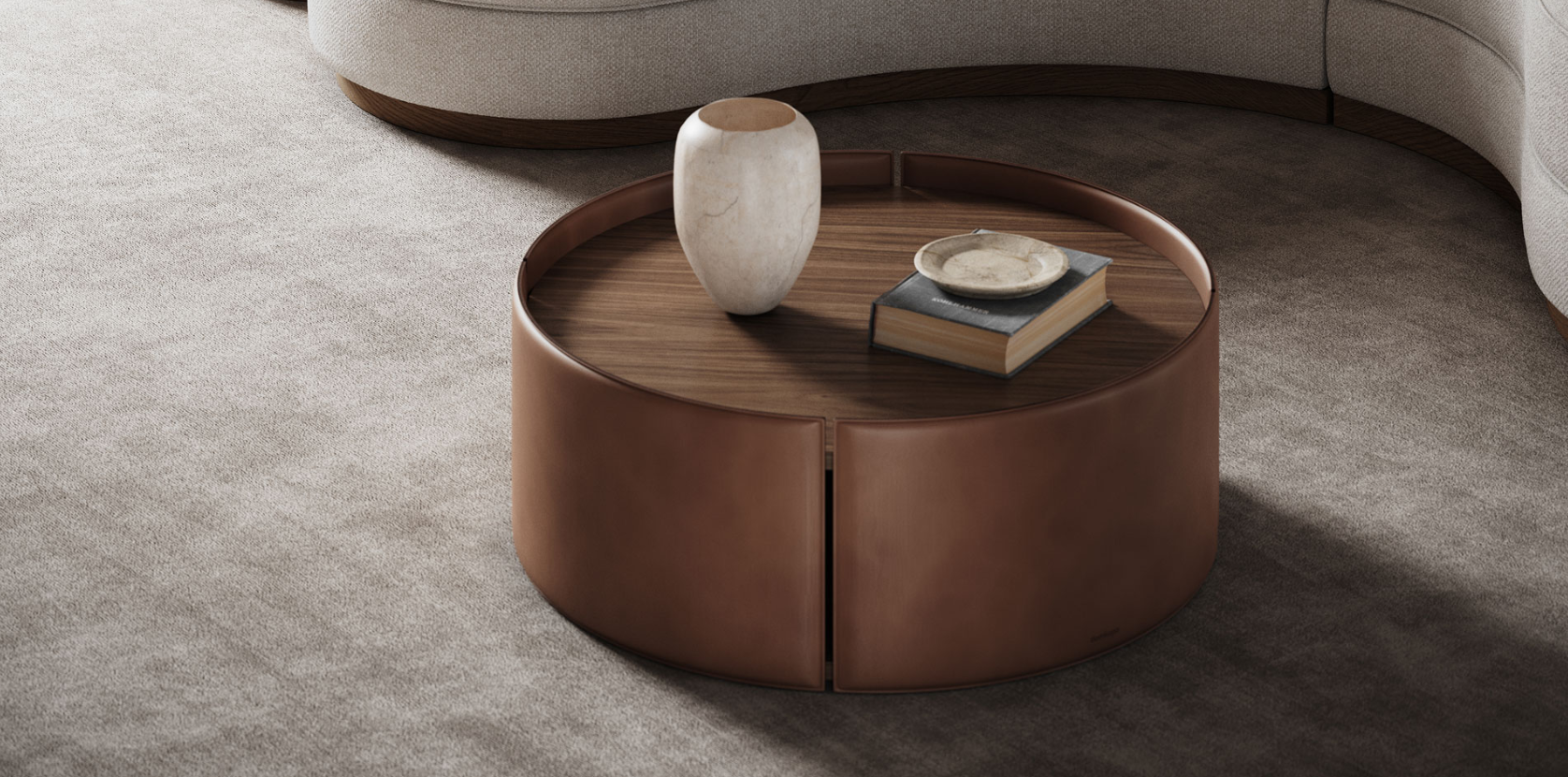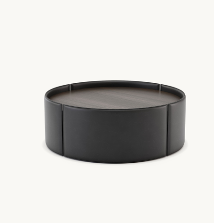 O piesă remarcabilă, cu un echilibru estetic și funcționalitate excelenta, îmbinându-se într-un design artizanal armonios. Structura sa rotundă este complet tapițată cu piele naturală, în timp ce partea superioară este realizata din lemn.