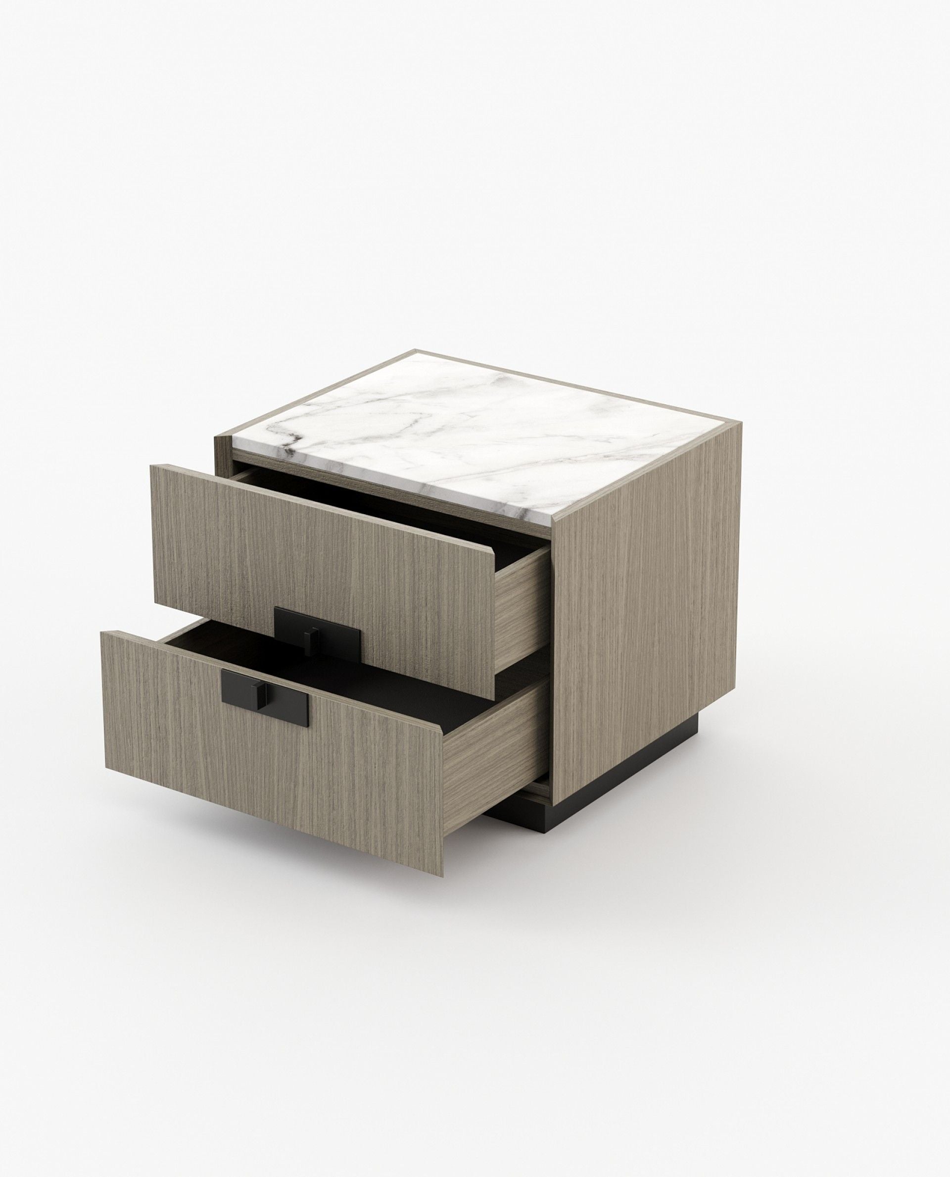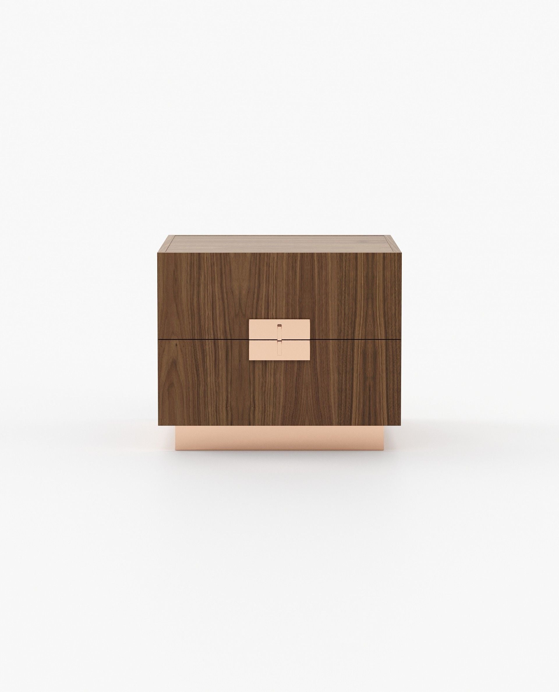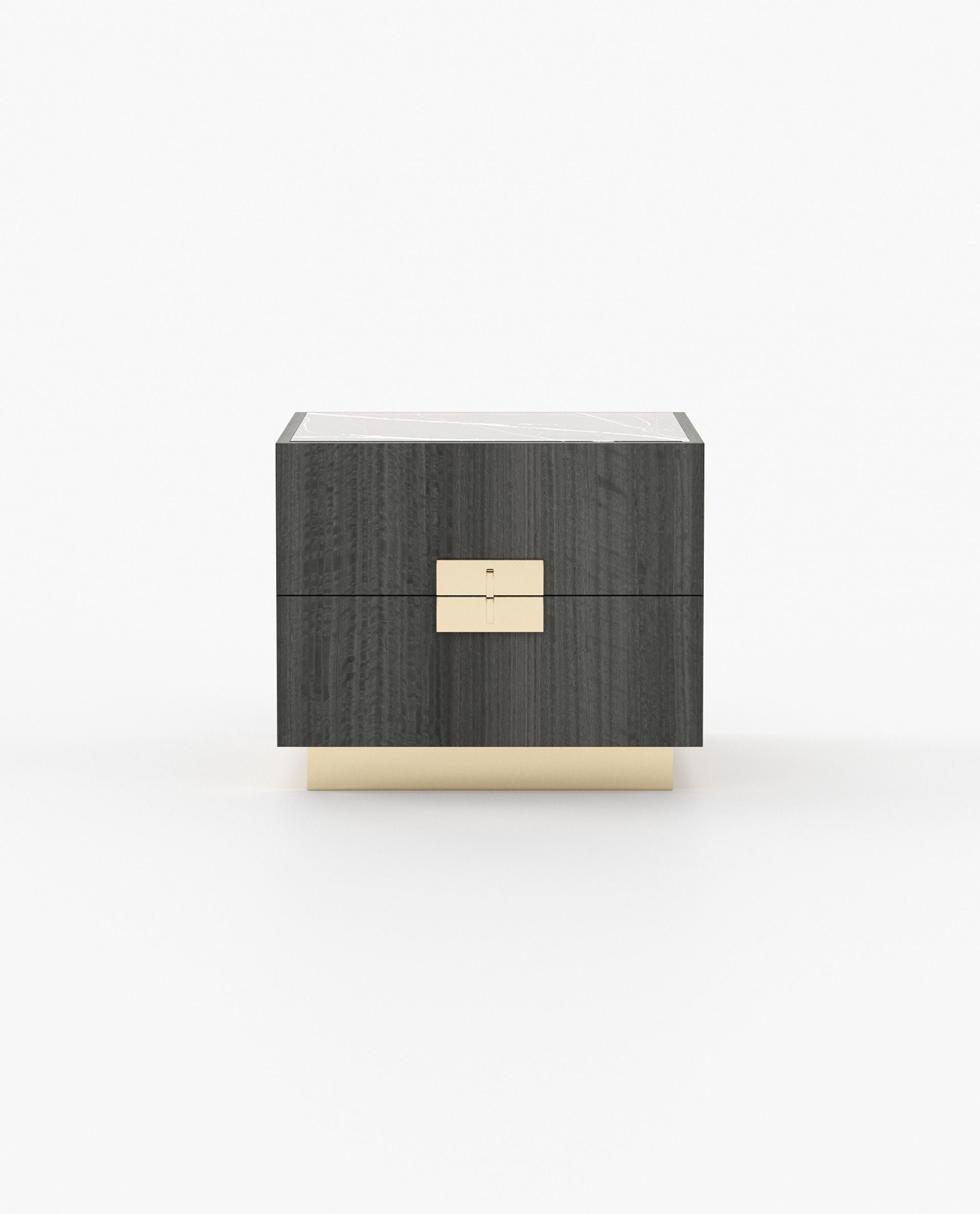 Noptiera Lady: o alegere sofisticată pentru interioare clasice. Această noptieră din lemn este prevăzută cu două sertare cu închidere silențioasă și o bază metalică în contrast, îmbinând măiestria atemporală a lemnului cu funcționalitatea elegantă.