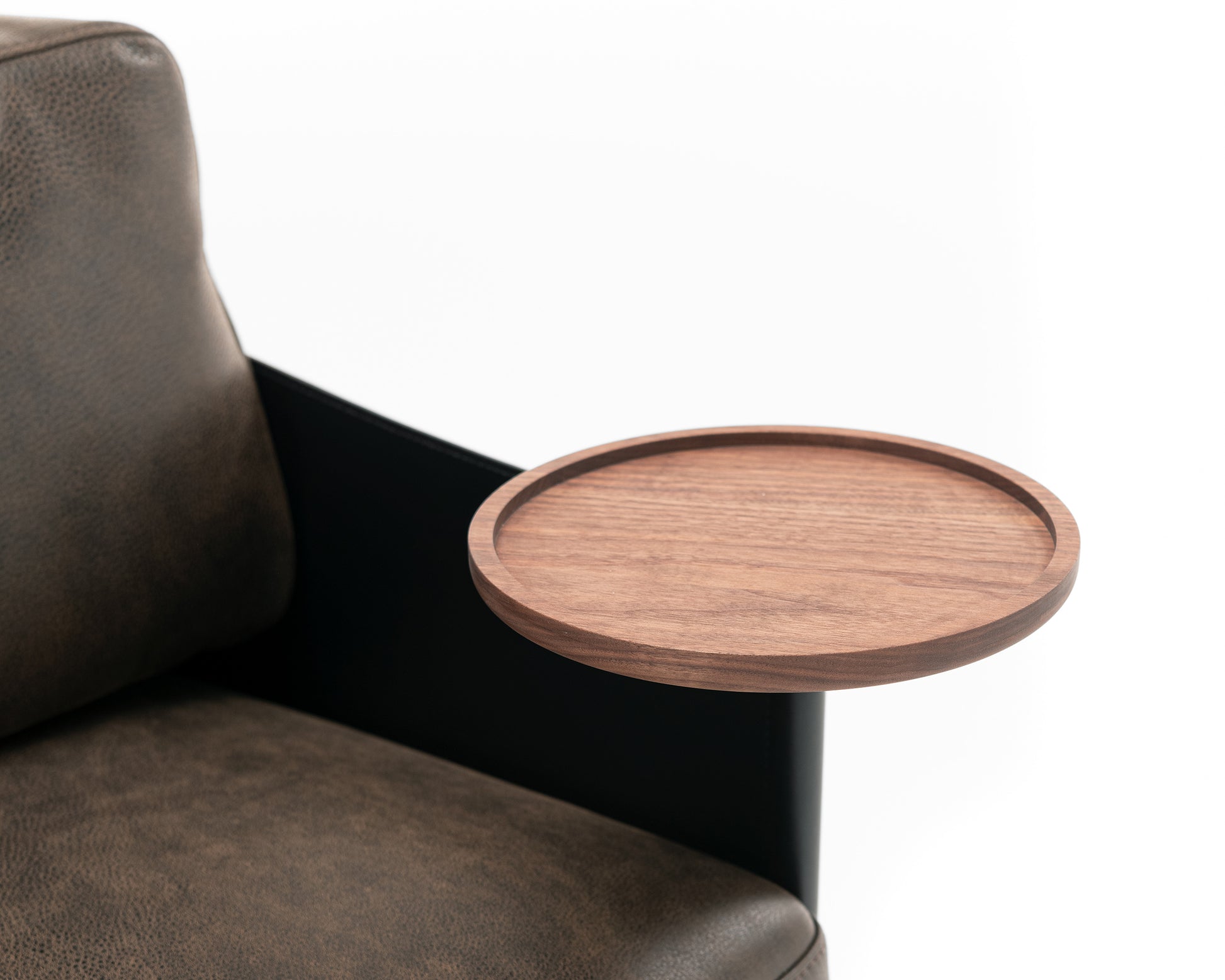 Un fotoliu elegant cu cadru de brad. picioare din metal vopsit negru și decorațiuni din nuc canaletto, cu dimensiuni reduse care interpretează o nevoie de lux casnic chiar și în spații mici. O „foașă” din piele, realizată cu experiență de maeștri lucrători calificați, din piele, învăluie delicat o pernă rotunjită. Atenția la detalii și puritatea formală extremă a structurii devin semnul distinctiv al SC1.
