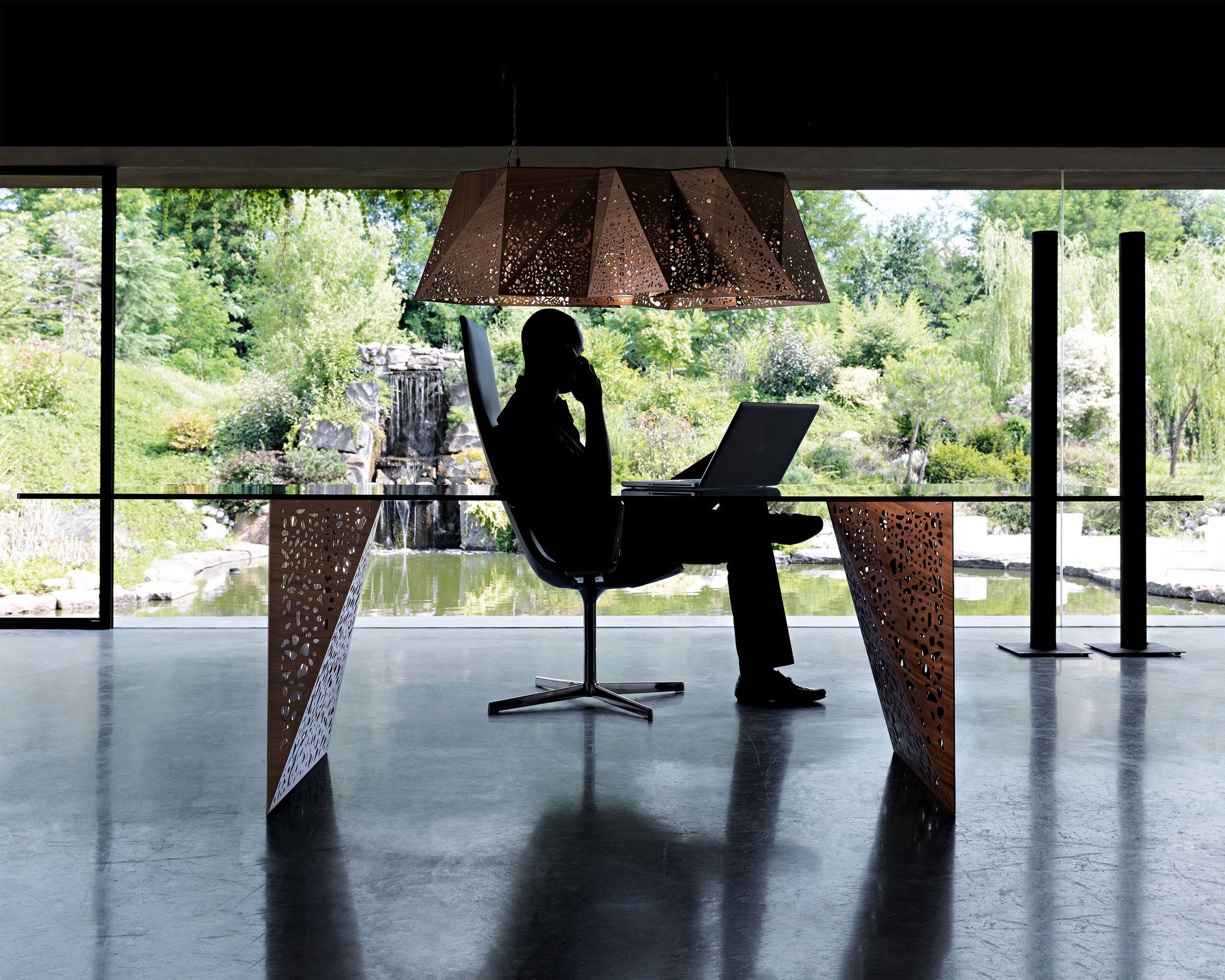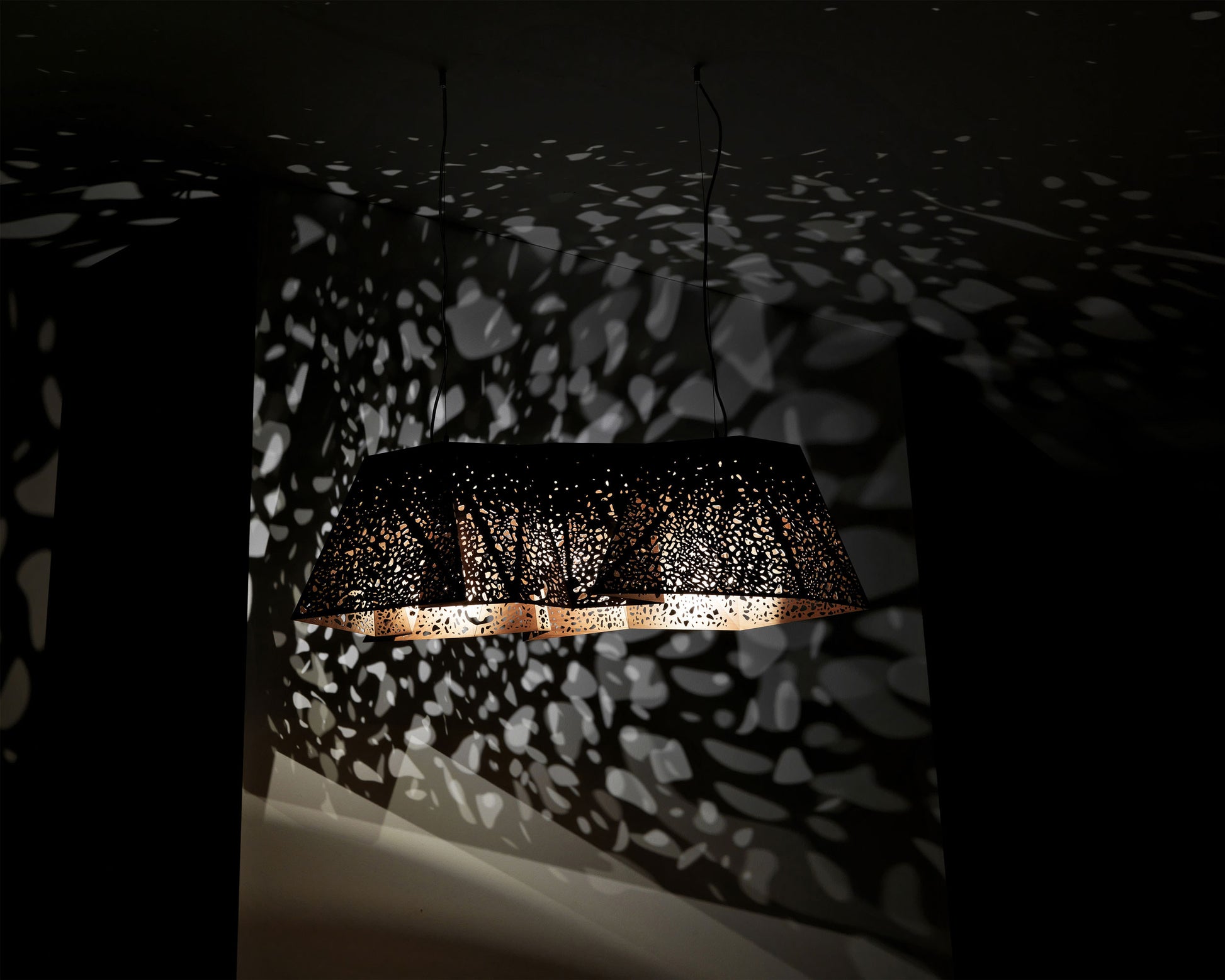 Creativitatea și inovația tehnologică se reunesc în această lampa, construită dintr-un material lemnos cu o grosime de doi milimetri, gravat cu laser și pliat ca un origami datorită unui proces tehnologic complex brevetat de Horm. Lumina LED, trecand prin gaurile din structura, produce jocuri de umbre in jurul sau.