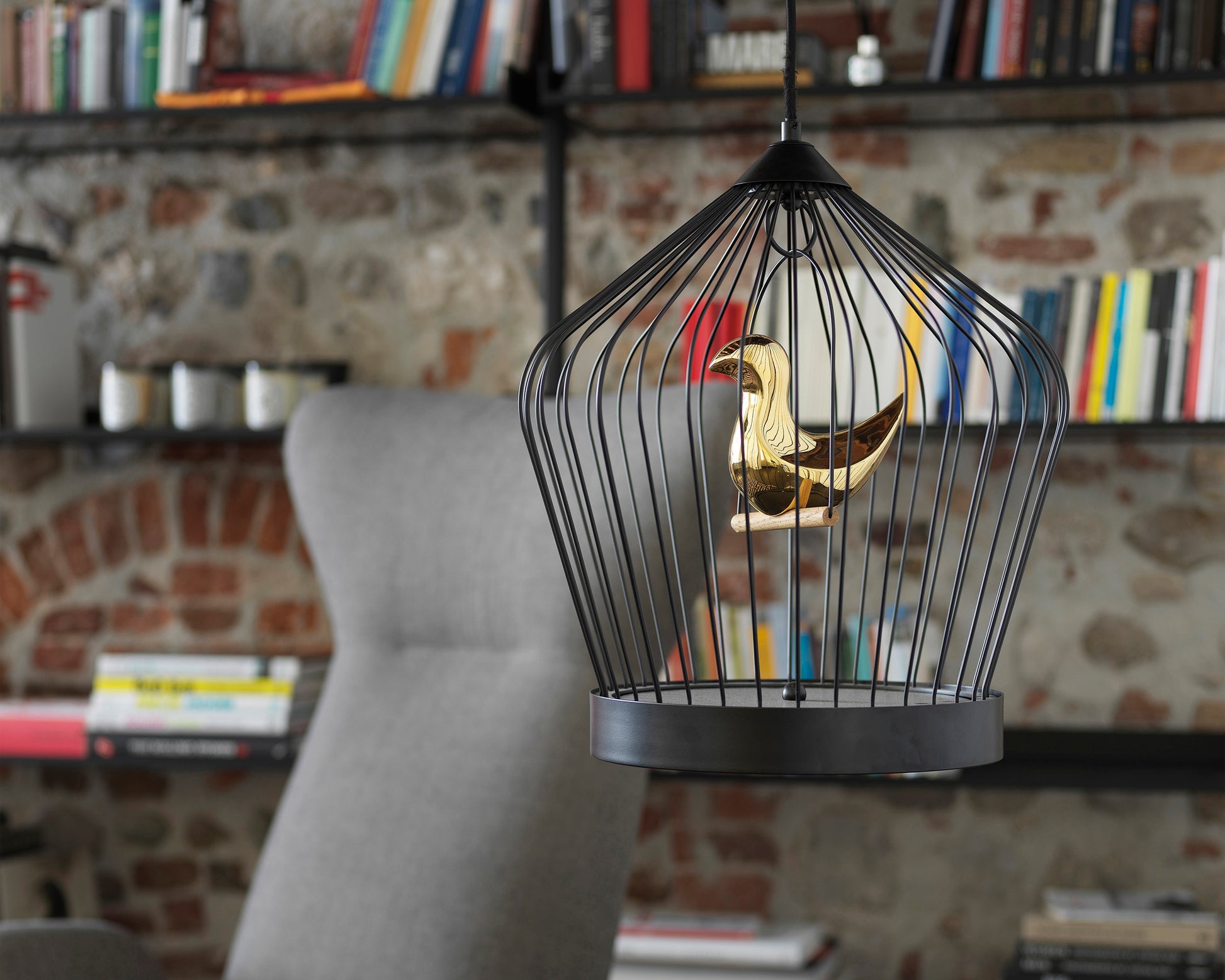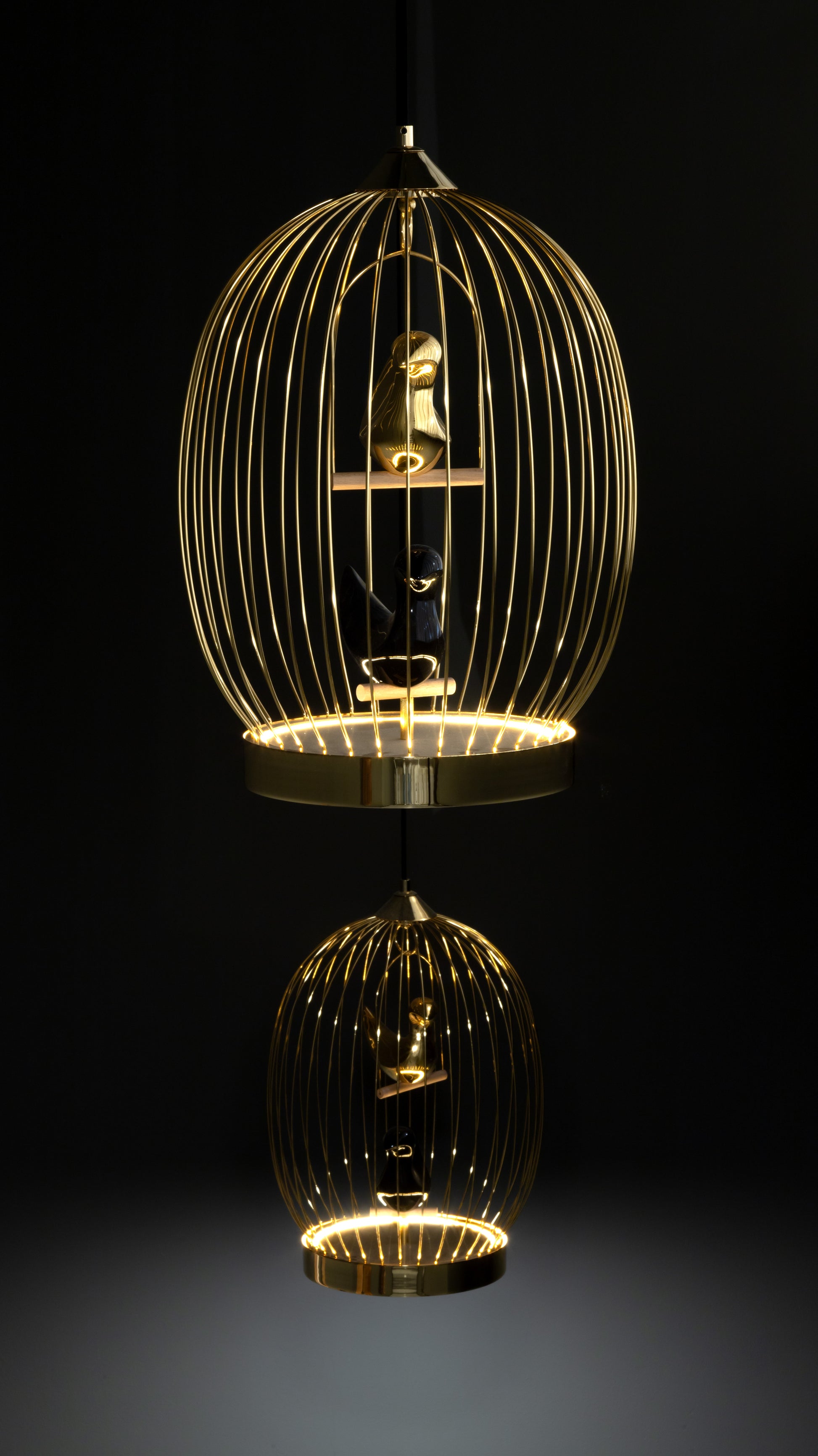 O figură simbolică care devine utila prin functia sa de iluminare. Păsările sunt realizate din ceramică decorată manual, vopsită în negru sau placată cu aur de 24 carate; structura din tije metalice vopsite în negru sau placate cu aur. Aparatul de iluminat cu LED este plasat la baza coliviei, acoperit de un scut dublu din policarbonat, care iluminează mediul înconjurător pe de o parte și interiorul coliviei pe de altă parte.