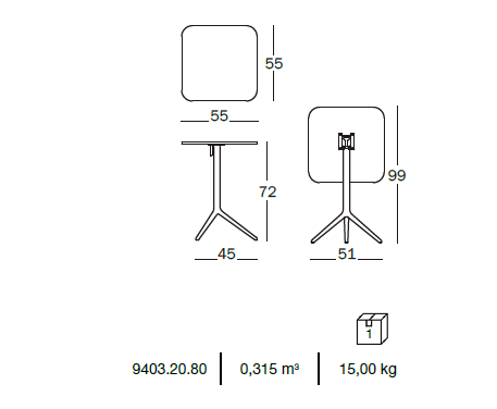 Cadru din aluminiu turnat, lustruit sau vopsit cu pulbere de poliester. Blat din HPL. Produs potrivit pentru uz in exterior.