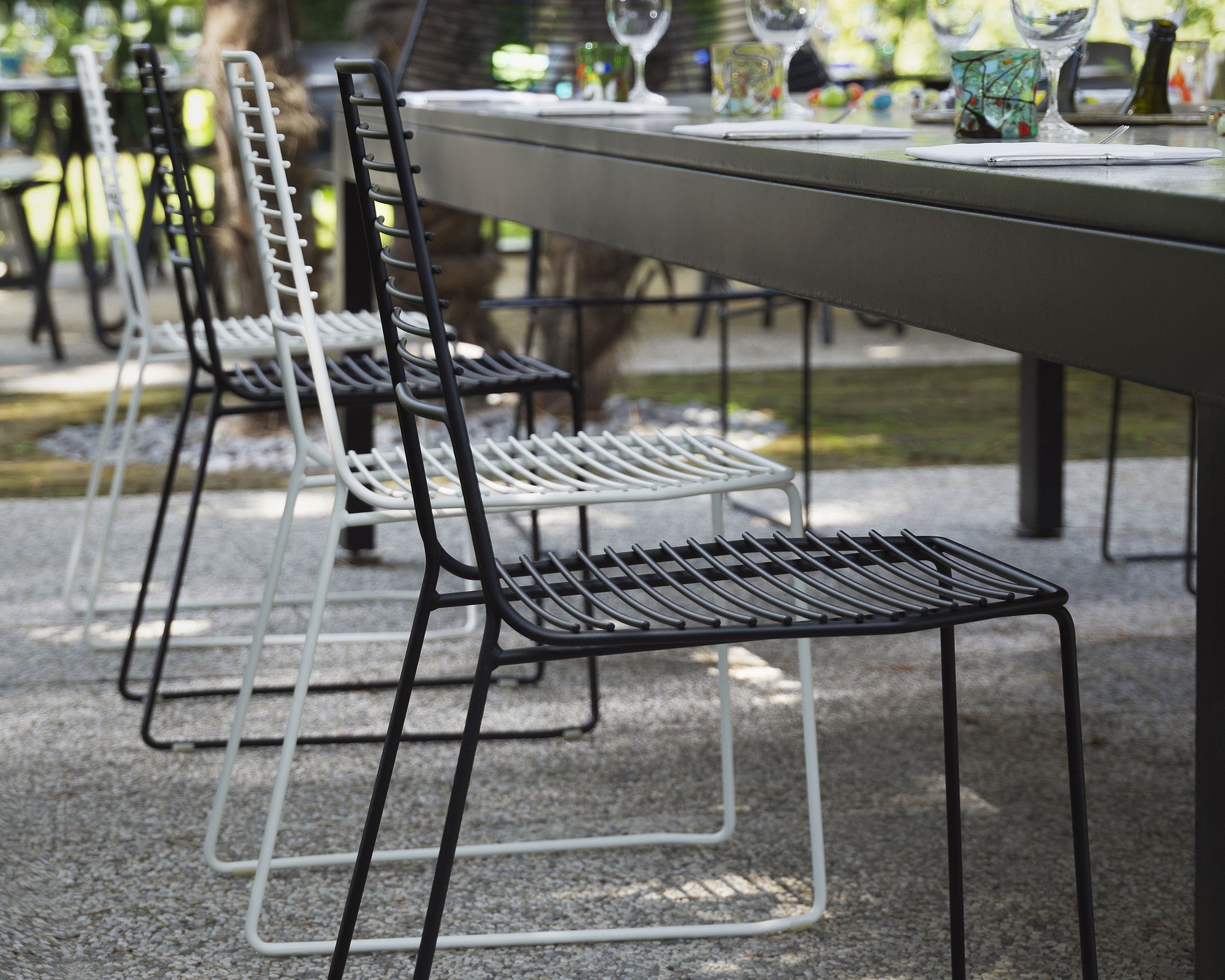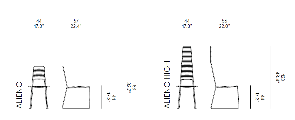 Scaune de exterior realizate din metal. Doua versiuni disponibile. Alieno si Alieno High, consultati tabelul cu marimile.
